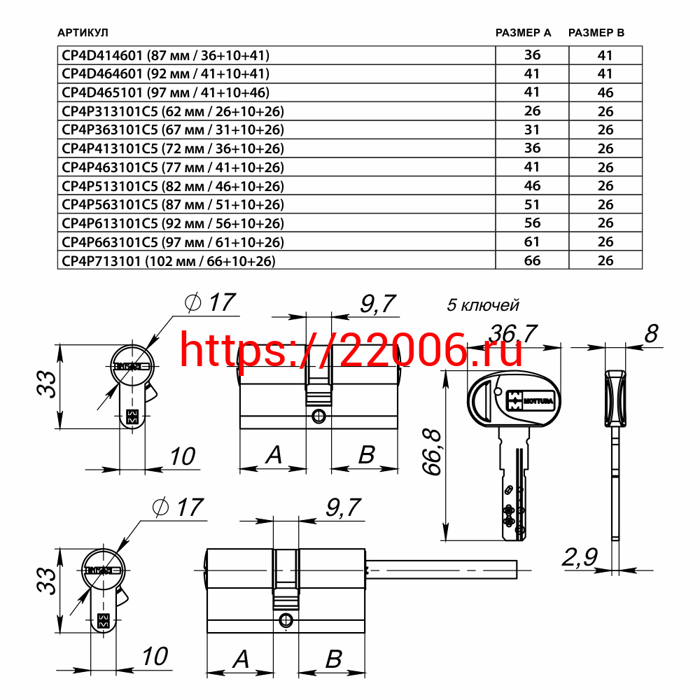 - Цилиндровый Mottura (Моттура) механизм CP4D414601 (87 мм/36+10+41) МАТ.НИКЕЛЬ в Воронеже недорого