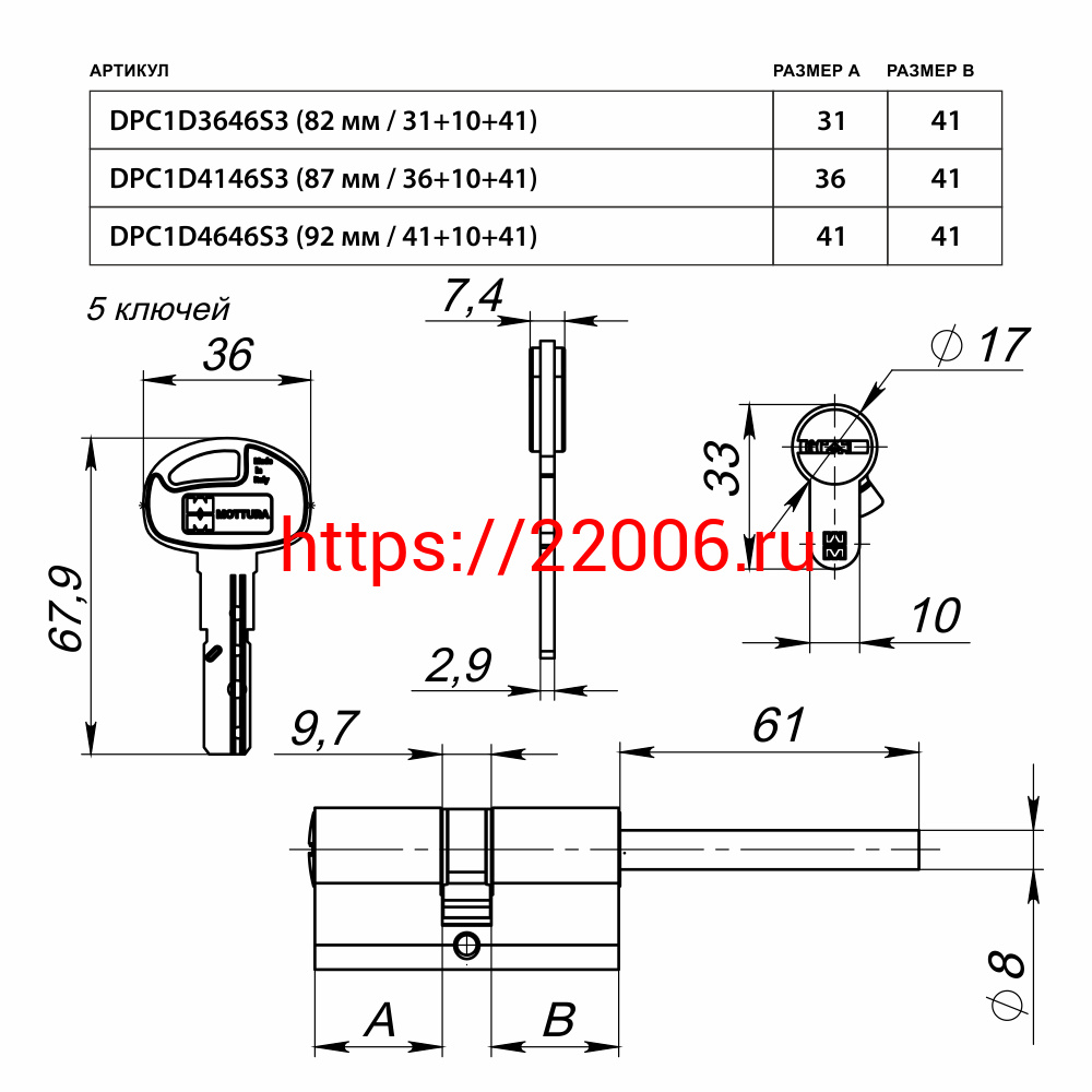 - Цилиндровый Mottura (Моттура) механизм DPC1D4646 S3 (92 мм/41+10+41) САТИН.НИКЕЛЬ, 5+1кл. в Воронеже недорого