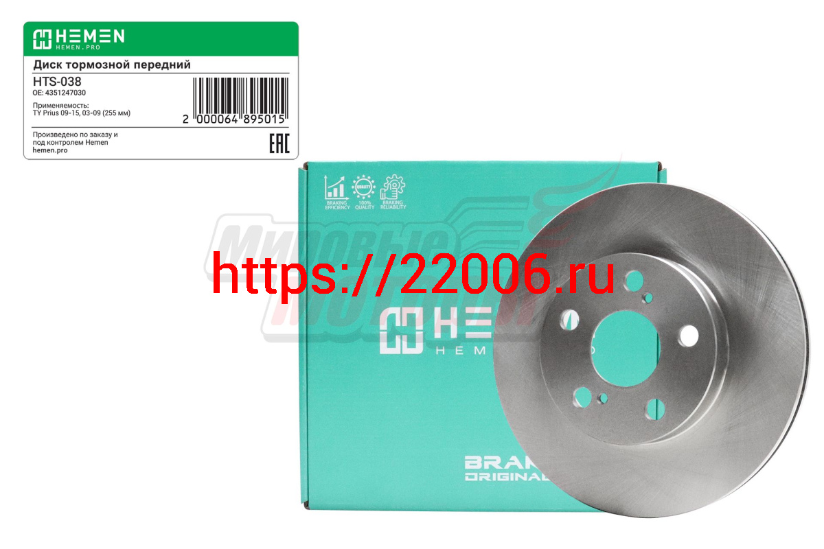- Диск тормозной передний Toyota Prius 09-15, 03-09,диам. 255 мм (HTS038) в Воронеже недорого